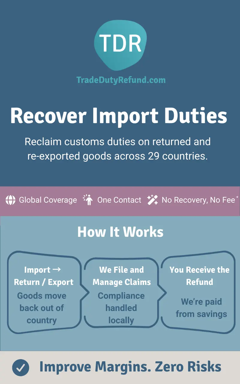 The headline use case is cross‑border eCom returns—recovering duties on international returns. When a shipped order comes back into your warehouse or returns hub, you often end up writing off the import duties and taxes, even though those goods are no longer consumed in the destination country. TDR helps structure the data, evidence and filing process to reclaim those amounts.
