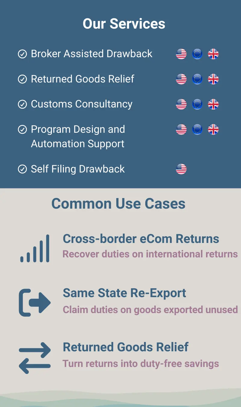To support these scenarios, the flyer summarizes TDR’s core service lines. Broker‑assisted drawback gives you access to experienced specialists and established workflows for US, UK and EU claims, without needing to build in‑house expertise from scratch.